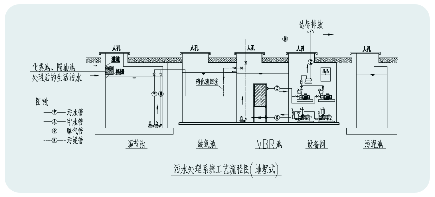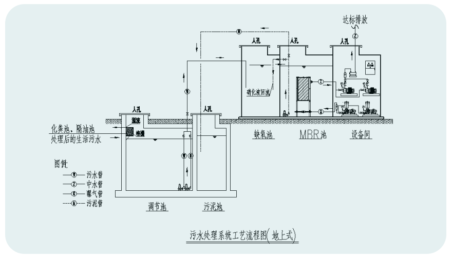 ● 分置式。將膜組件置于地下水池內;將風機、抽吸泵、電氣控制部分置于地上設備間內。
