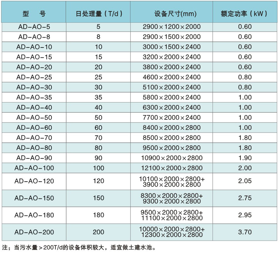 AD-AO型一體化污水處理設備規格參數表