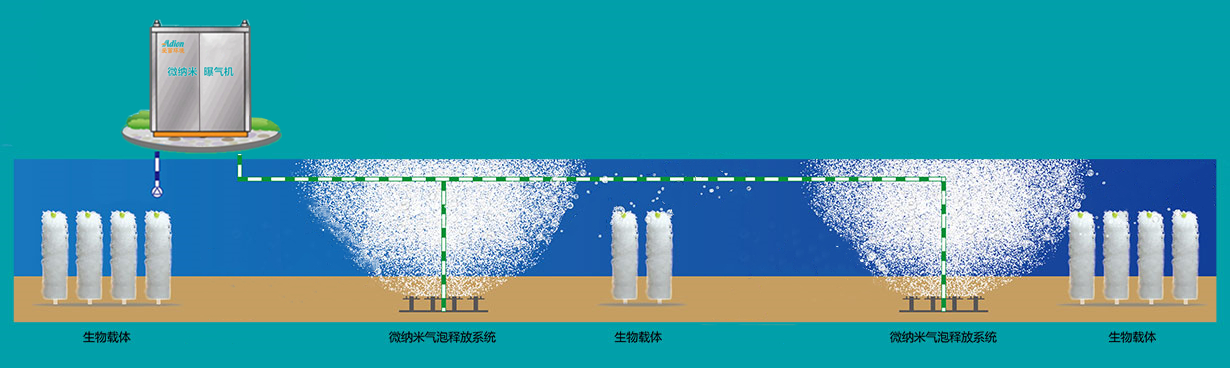 在水體中構建一套微生態系統對水體進行原位凈化。在河道中設置仿生人工水草作為生物載體,為土著微生物及早期投加的高效微生物提供一個附著、繁殖、反應的環境。同時配置微納米曝氣裝置,其產生的微納米氣泡不但能給水體高效增氧,增強微生物菌群的活性,同時還具有浮選懸浮物的功能,通過“氣浮效應”可將水體中的細小的懸浮顆粒帶出水面,提升透明度。