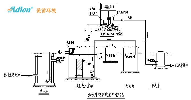 綜合以上的特點,農村污水處理方案在工藝選擇時盡量選擇處理效果好、占地少、抗沖擊力強、管理方便、無污泥或污泥量少的工藝。由于生化處理具有高效,低能耗的特點,所以,該類項目污水處理工藝首選膜生物反應器生化處理。對村莊污水收集后,利用上海愛笛的A1-MBR或A2-MBR型污水處理設備進行就地處理,達標排放。