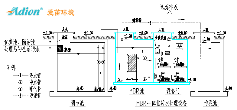 說明:化糞池及調節池采用鋼混結構;A1-MBR迷你型智能化污水處理設備采用PP材質,采用室外地上式安裝,便于管理和維護。如為二級標準可省去缺氧池。