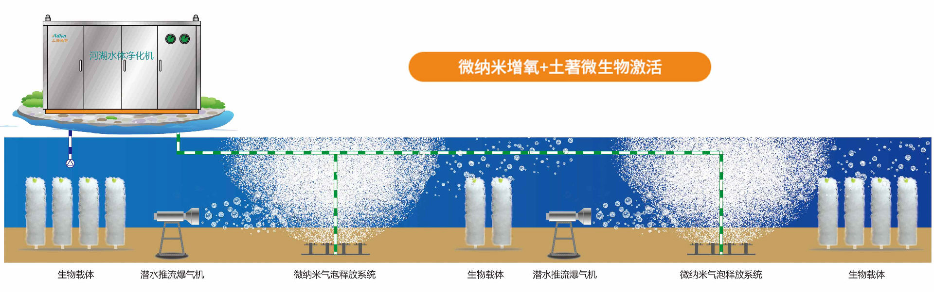 因此,要從根本上治理黑臭問題,除了做好外源截污及適當清淤的前提下,須解決水體中溶氧的不足,并修復水體中的微生態系統,提高水體的自凈能力。