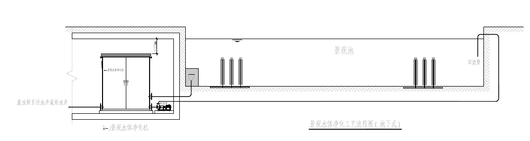 設備采用不銹鋼一體化結構,布置在湖邊的機坑內(原有),由原有的進水管將湖水引入設備中進行處理,再由回水泵將景觀出水提升到出水管中,出水管在湖中設有多個出水口,將出水返回到景觀湖中,實現水體的循環凈化。