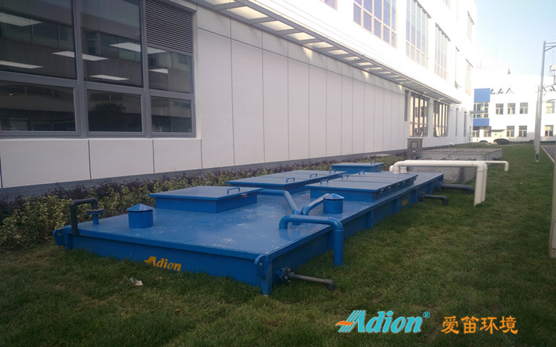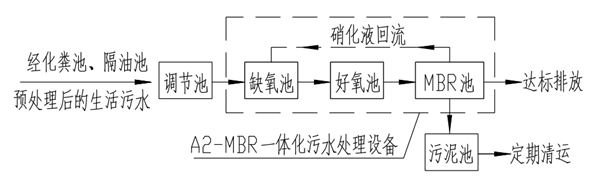 工藝流程 采用上海愛笛研發(fā)的A2-MBR污水處理設(shè)備作為核心工藝。在污水進(jìn)入設(shè)備之前需要預(yù)處理,根據(jù)生活污水水質(zhì)的特點(diǎn),對食堂污水進(jìn)行隔油處理;廁所污水進(jìn)行化糞處理。預(yù)處理后的水質(zhì)最終進(jìn)入反應(yīng)池內(nèi)進(jìn)行處理,出水可穩(wěn)定達(dá)到較高的排放或回用標(biāo)準(zhǔn)。
